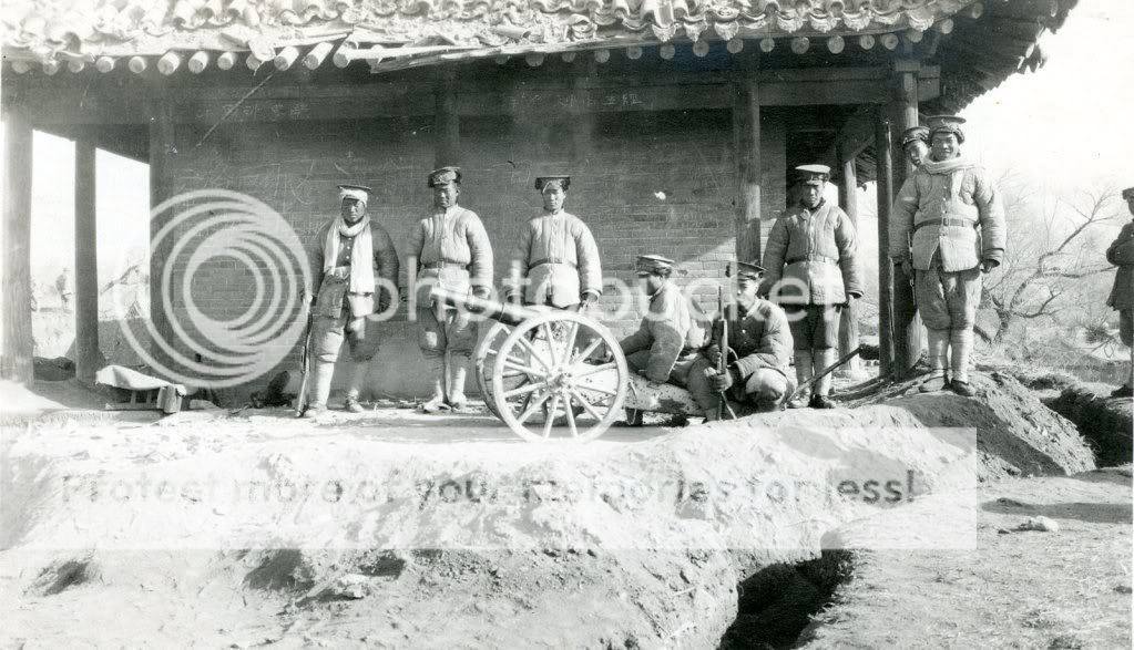 From a [ame="http://www.dramasian.com/forum/showpost.php?p=741347&postcount=40"]previously noted[/ame] private collection discovered on Picassa Web Albums (Google's free picture gallery) as hosted by generous netizen Joe. He has a collection of images that (from what information I could gather on his gallery), seems to have been taken by one I.E. Oberholtzer in or around the Liao Chow area of Shansi, (I suspect this may be modern day Liaozhou, Shanxi Province, but I'm having a bit of difficulty getting cross referenced confirmation), China, during the 1920-1930s. Once again, it is due to the dedication of private citizens that images which would otherwise be lost to history, is instead seen by all. This validates and burnishes that part (in this case, of a part of China), and makes indelible an isolated stitch in the fabric of time. Woven together with the contributions of others, that fabric becomes a tapestry that testifies to our collective history in a vital visual record. We all hold a debt of gratitude to the generosity of such net contributors. Spoiler: Original Photograph... Entitled Militarism in China. Here are specimens of the Soldiery who protect the people by dominating them, who protect property by looting it Liao Chow, Shansi, China [c1925] IE Oberholtzer (probable) [RESTORED] I did light scratch and spot repair, adjusted tone, contrast, added a sepia coloration, and cropped away the partial view of the individual on the far right edge. The original is behind the spoiler, and can also be seen by clicking on the very long descriptive title. Most people consider the China of today as a nation that has 5000 years of continuous unbroken history as one political entity; that is not so. As recent as a century ago, China was politically fractured akin to a nation say, like Pakistan, where the central government held political sway in name only. Genuine authority outside central urban areas resided in the hands of well financed individuals, called warlords, each armed with their own personal army. Spoiler: Map of War Lord Political Spheres of influence, China 1925... Source: [ame="http://en.wikipedia.org/wiki/Warlord_era"]The Warlord Era[/ame] Warlords held their positions by strength of the sword, and areas under their control were effective fiefdoms that the Chinese central government had little or no control over. At times, even central government commerce movement needed to tender road tariffs to these local governments before being allowed passage. These regional governments functioned by their own rules, often created at the whim of their leader. They fought not only with the government but with each other. Between the years of 1912 and the second world war, most people understand and remember the national struggle between the communists and the nationalists in China. In fact, the nationalist government was only in nominal control, with the communists being but one external factor, along with a variety of warlord cliques and subordinate factions that competed for overall supremacy in 8 major geographic areas. Opportunistic coalitions often formed to work either against, or with the Nationalist government; though allegiances were well acknowledged to be something ephemeral as parties easily traded loyalties according to their individual needs of the moment. Regional armies with fidelity to a local leader instead of a national government wasn't an entirely new concept to the Chinese of the times. In fact this was business as usual as far as Chinese history was concerned. During the monarchy, Qing standing regional Bannermen armies could likewise have been a template for the Warlord phenomenon. Each Banner was separate and distinct from the others and only loyal to themselves, and not to any idea of national government, per se. They fought for the throne because they were paid to. Thus, they were similar to mercenary armies at the service of the government Spoiler: ***Sidebar*** The Qing Bannermen... The Qing Bannermen standing armies, in theory, is not at all unlike present day Blackwell industries, which has deployed private armed fighters in combat zones around the world in their work for the US government. One has to wonder if the Talib or Al Qaeda paid better, would they then turn their guns on their flag? But that's a question for another day and another forum. During this period of national crisis, Outer Mongolia, long a part of the Qing empire, (under strong Soviet influence) successfully broke free and became, de facto, independent from China in 1921 . The Chinese nationalists successfully kept Xinjiang and Xizang (aka Tibet) from breaking away, and were also successful in keeping most other nations from further colonizing what was essentially a broken and defenseless China. The Warlord private armies in essence were regionally raised military militias that were privately trained. They were armed with a variety of western equipment and in one battle alone (Central Plains Battle of 1930, in which three warlords allied against the central Nationalist government), involved an estimated one million troops. These troops rode roughshod over the populace with impunity. They were notorious for robbing, raping, and pillaging everywhere they went. If they didn't have enough men to perform support functions (like build fortifications or carry away loot), they would gang impress local manpower as slave labor. They would often take whatever crops there were, and allowed the local population to subsist on starvation rations. As patronage mills, they allowed men of affluence to buy officer postings either for themselves or their sons, to serve as midlevel leaders within a warlord's army. The situation was so socially severe and dire that the populace hungered for relief and easily bought into the communist message of land ownership reform, equality of treatment, shared burden, and national defense. This helped set the stage for the mass support that Mao needed to overthrow the nation