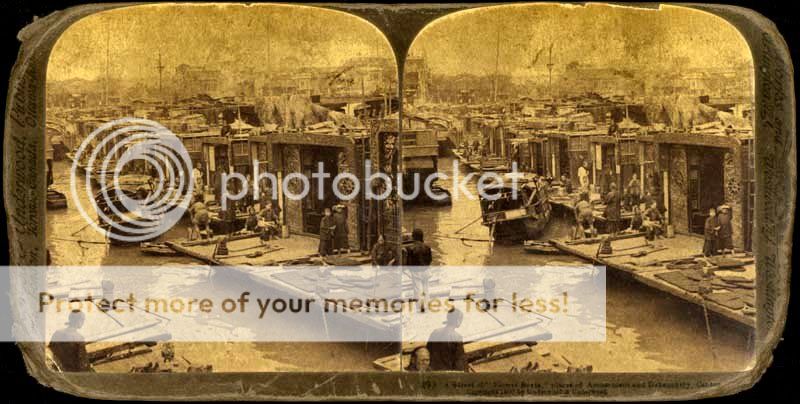 Emil Rusfeldt was considered a member of the second wave of western photographers whose photographs of China have been said to represent the embodiment of that era (his compatriots were William Saunders and John Thomson). Working out of a studio called the Hong Kong Photographic Rooms (a sort of historic way station for many of those noteworthy China photographers), Rusfeldt produced a wide ranging record of those times. Spoiler: Original Photograph... Entitled Flower Boats Canton [c1871-1874] E Rusfeldt [RESTORED] I did the usual spot and defect removal, tonal and contrast adjustments, with a final Sepia tone. The original is behind the spoiler. I found this pic on a personal Flickr page. The page owner, someone named Etherflyer, had apparently scanned the image from a book called Imperial China: Photographs 1850 - 1912. The picture shows several of the many Flower Boats that had stationed themselves in the waters of old Canton. A euphemistic term for bordello, these were essentially floating houses of prostitution that offered up dinner, music, and carnal entertainment along the banks of the many rivers that coursed through Canton. At one point thousands of these ornate, palatial boats prospered in that busy port city. Other works that documents the trade are behind the second spoiler: Spoiler: The Sampan Sellers & other items of note... Source: http://ocw.mit.edu/ans7870/21f/21f.027/rise_fall_canton_03/cw_essay02.html