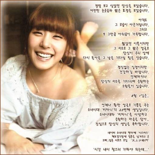 HERE IT IS AGAIN! HAPPY BIRTHDAY!! SNSD’s Tiffany celebrated her birthday today and was congratulated by fans around the world. SNSD’s fan cafe ‘Sisters‘ printed an ad in a daily magazine on August 1st to celebrate Tiffany’s 23rd birthday. A cafe member stated, “We still have lingering images from SNSD’s 2nd solo concert. Many fans are experiencing side effects, so I hope Tiffany’s beautiful smile can cure them all. I sincerely wish her a happy birthday and hope that she’s always healthy.” ‘Sisters’ also volunteered at a children’s foundation back on July 17th to commemorate Tiffany’s birthday. They will donate ‘happy beans’ as well to various charitable agencies. Meanwhile, ‘Sisters’ is collaborating with Tiffany’s Taiwanese fan site ‘Tiffany’s House‘ to deliver gifts to the birthday girl. Source:Allkpop